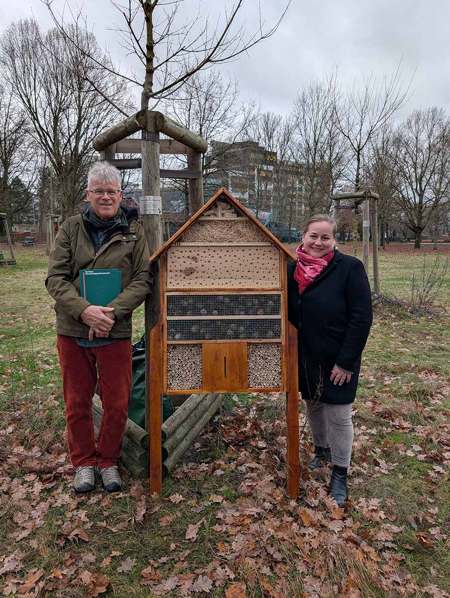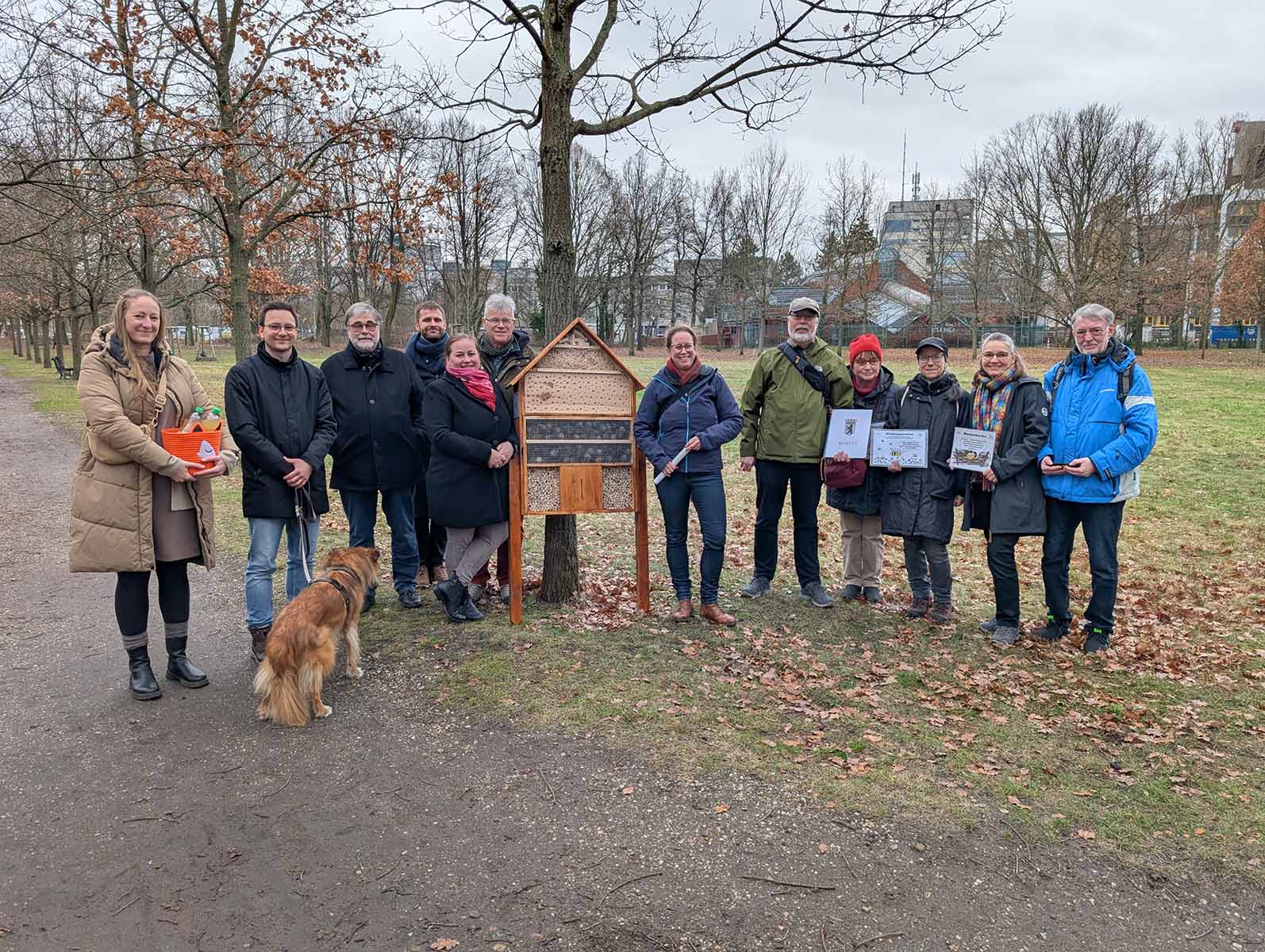 Direkt im Anschluss ging es zum fliegenden Wechsel zum Rathaus Reinickendorf um uns da mit den zwei weiteren Preisträgern beglückwünschen zu lassen. Besonders froh bin ich hierbei, dass unser Kooperationspartner, der NABU Reinickendorf, dieses Jahr Platz 1 mit seinem Engagement in Reinickendorf bekommen hat und wir Platz 3. Wir haben also im Vergleich zur letzten Auszeichnung von vor 2 Jahren die Plätze getauscht, was die Wertschätzung der großartigen Arbeit den NABU Reinickendorf besser repräsentiert, denn auch 2022 hätten wir ohne die Kooperation mit dem NABU keine Auszeichnung bekommen. Der Preis hierfür ist dieses Jahr ein Insektenhotel, welches im Frühjahr auf unserem Schulgelände aufgebaut wird und wo die beteiligten Schüler der Klasse WKK32 die Möglichkeit bekommen zu erleben, wie wertvoll ihre Arbeit hier für unsere Schule und den Bezirk Reinickendorf ist.