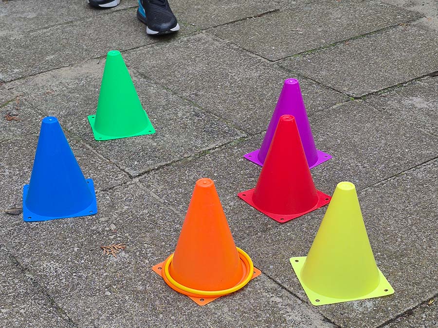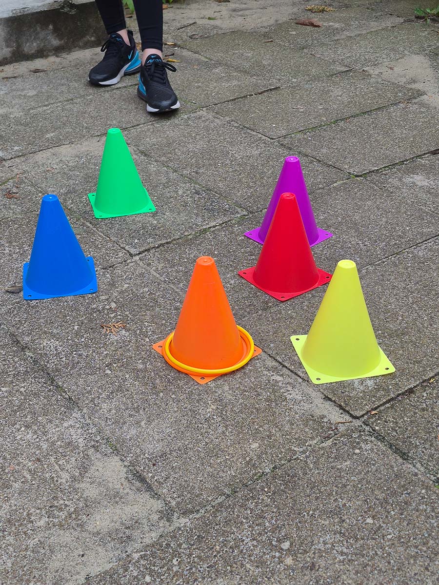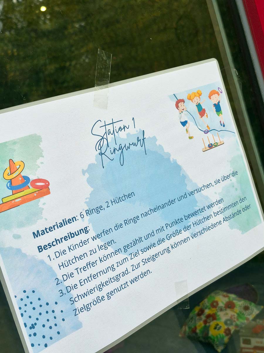 Die Kinder haben hier versucht Ringe auf Hütchen zu werfen. - Station 2: Balancieren über Himmel & Hölle