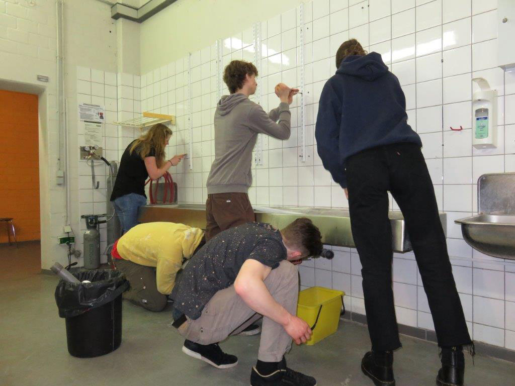 Viele tatkräftige Hände des 2. Ausbildungsjahres der Brauer/-innen sorgten unter fachkundiger Anleitung des Kollegen Sasse dafür, dass der Braukeller nun übersichtlicher geworden ist und darüber hinaus mehr Platz zur Verfügung steht. Die alten Regale und die Spülmaschine verschwanden, dafür wurden ein neues Regal installiert, ein weiterer Schrank aufgestellt und eine neue CO2-Leitung gelegt.