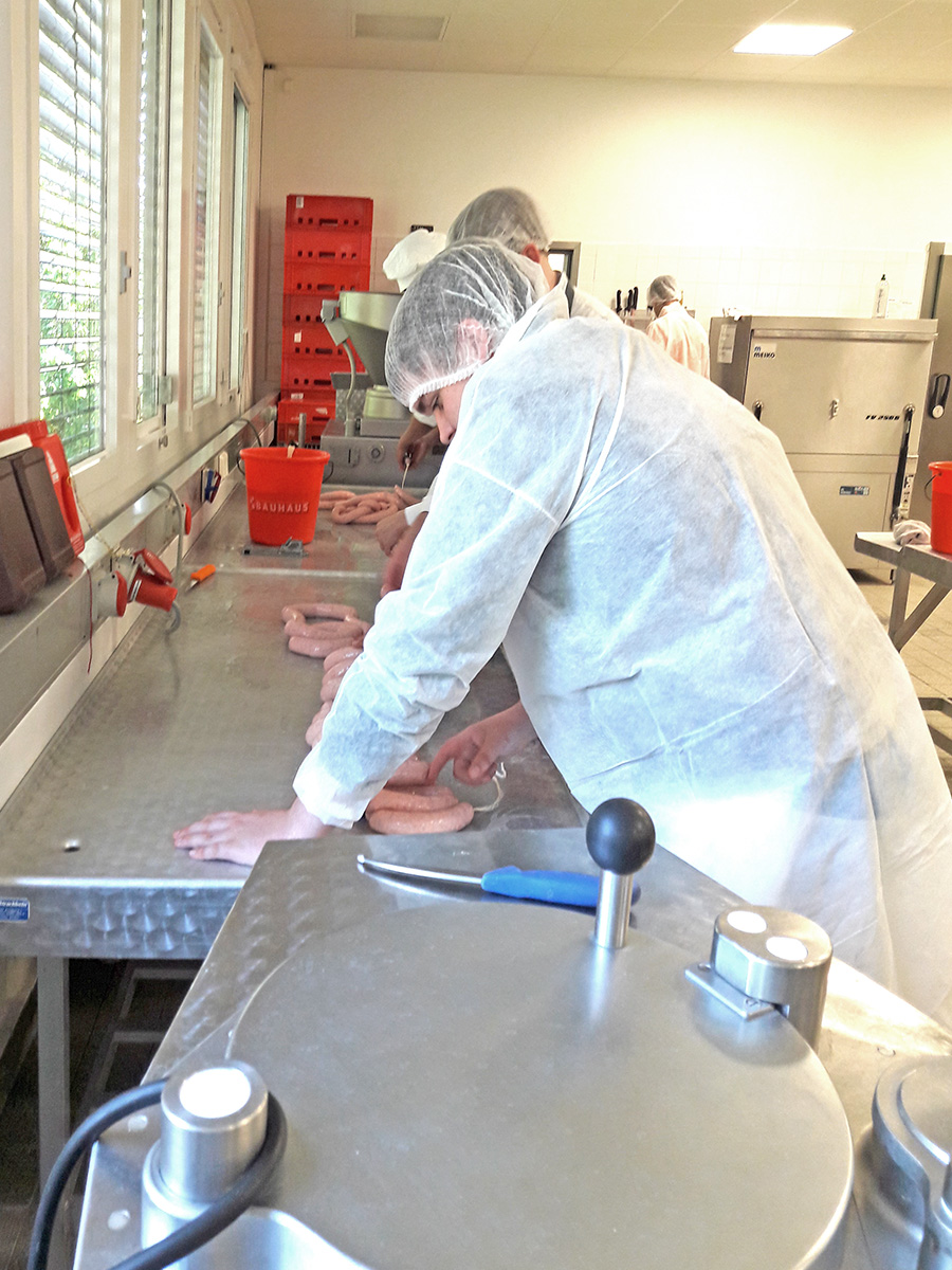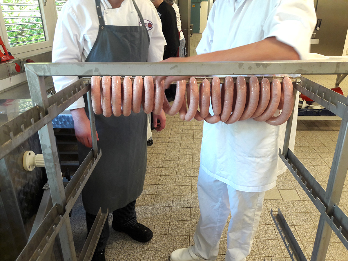 Ein Vorzug der Bratwurstherstellung ist die Möglichkeit der sensorischen Verkostung am gleichen Tag, sodass es zum Mittag selbst hergestellte Bratwurst gab. Durch die freundliche Unterstützung unserer Bäckerei wurden auch noch frische Brötchen gereicht. Die Knacker wurden entsprechend gereift und geräuchert und von den Schülern am nächsten Tag abgeholt, sodass diese an der Brillat-Savarin-Schule beurteilt werden konnten.